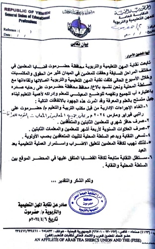 وتلقت منصة حضرموت نسخة من البيان، يُعلن فيه عن صرف الرواتب وحوافز شهرية للمعلمين في حضرموت، بالإضافة إلى تثبيت المتعاقدين.