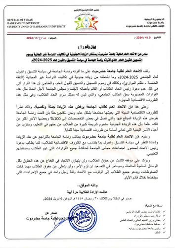 بيان رقم ( 1 ) صادر عن الاتحاد العام لطلبة جامعة حضرموت يستنكر الزيادة الجنونية في تكاليف الدراسة غير المجانية ورسوم التسجيل للقبول العام، الذي أقرته رئاسة الجامعة في سياسة التنسيق والقبول لعام 2024-2025م
