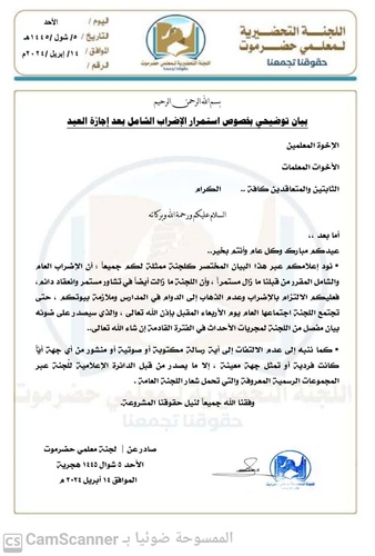 وأصدرتْ لجنة معلمي حضرموت بيانًا توضيحيًا تُؤكّد فيه على استمرار الإضراب، وتشدّد على ضرورة استجابة الحكومة لمطالب المعلمين المتمثّلة في تحسين أوضاعِهم المعيشية وتوفير مستحقاتهم المالية.