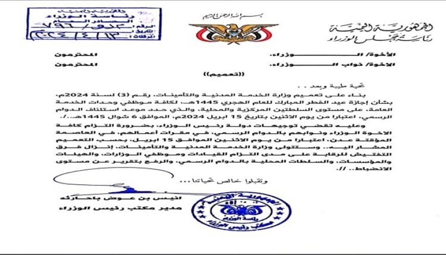 رئاسة الوزراء تعلن إنتهاء إجازة عيد الفطر وتوجه الخدمة المدنية بإلزام المواظفين