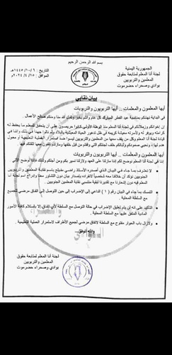 لا نعترف بما جاء في البيان الذي أصدره الأستاذ راضي مفيلح باسم نقابة المعلمين والتربويين الجنوبيين نؤكد أن خلافنا معه شخصياً لانفراده بإصدار بيان دون التشاور معنا وإدراج اسم لجنة أنا المعلم فيه دون إشعارنا مع تقديرنا لبقية منتسبي نقابة المعلمين الجنوبيين التمسك بما جاء في البيان رقم ( ۱ ) الداعي إلى الإضراب إلى حين التوصل إلى اتفاق مرضي للجميع مع السلطة المحلية . .