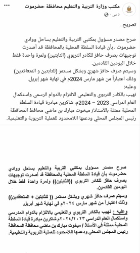 مصدر مسؤول بتربية حضرموت يصرح بصرف حوافز شهرية للتربويين