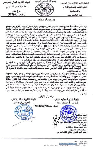 أصدرت اللجان النقابية بمطابع الكتاب المدرسي بياناً ، أدانت فيه السلطة المحلية ومكتب التربية بمأرب.