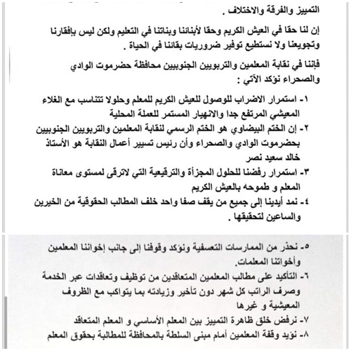 وأصدرت نقابة المعلمين والتربويين الجنوبيين في محافظة حضرموت /الوادي والصحراء بيانًا أكدت فيه على استمرار الإضراب الشامل في جميع مدارس المحافظة.