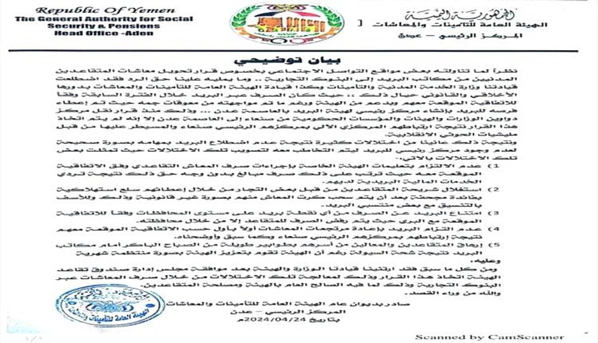 وقالت الهيئة العامة للتأمينات والمعاشات في بيانها :نظراً لما تناولته بعض مواقع التواصل الاجتماعي بخصوص قرار تحويل معاشات المتقاعدين المدنيين من مكاتب البريد إلى البنوك التجارية، وما يمليه علينا حق الرد فقد اضطلعت قيادتنا وزارة الخدمة المدنية والتأمينات وكذا قيادة الهيئة العامة للتأمينات والمعاشات بدورها الأخلاقي والقانوني حيال ذلك.