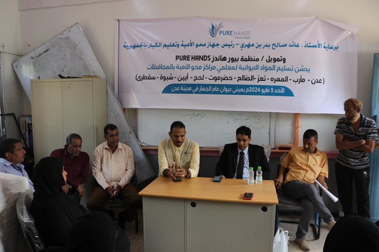 برعاية الأستاذ عائد صالح بدر بن مهري رئيس جهاز محو الأمية وتعليم الكبار بالجمهورية وبتمويل من منظمة بيور هاندز PURE HANDS دشن صباح اليوم الأحد 5/ مايو/ 2024 بديوان عام الجهاز بالعاصمة عدن تسليم المواد الإيوائية لمعلمي مراكز محو الأمية بالمحافظات (عدن- مأرب- المهرة- تعز- الضالع- حضرموت- لحج- أبين- شبوة- سقطرى).