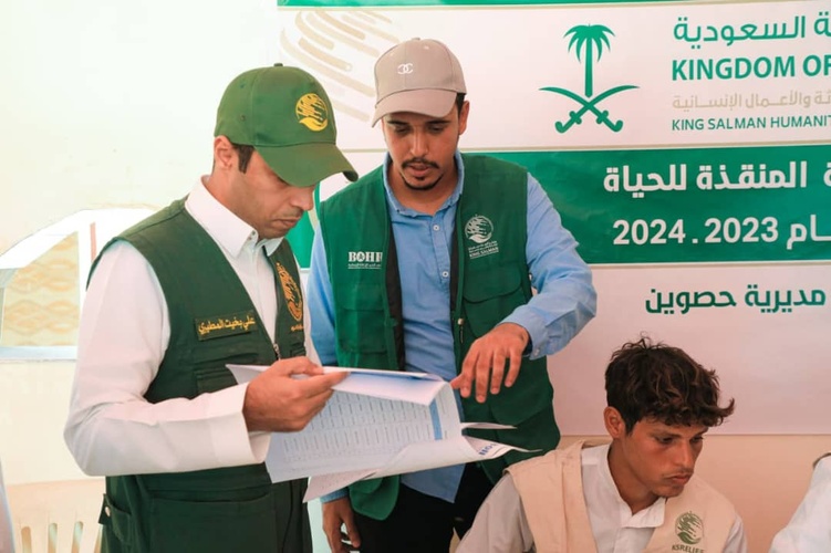 فريق من مركز الملك سلمان للإغاثة يطلع على توزيع المساعدات الغذائية بمديرية حصوين