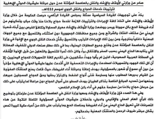 أصدرتا وزارتي الأوقاف والإرشاد و النقل بالعاصمة عدن بيانا هاما حول عرقلة مليشيات الحوثي الإرهابية لترتيبات خدمات الحجاج والنقل الجوى لموسم 1445هـ
