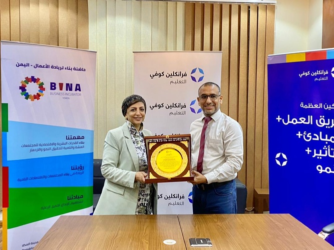 قدم رئيس مؤسسة حاضنة بناء لريادة الأعمال الدكتور ربيع العوبثاني درعًا تذكاريًا للمدربة البحرينية مستشار أول مؤسسة فرانكلين كوفي للتعليم - الشرق الأوسط الأستاذة هدى الخواجه، وذلك تقديرًا لجهودها المتميزة في تنفيذ برامج وورش عمل تدريبية لعدد من المديرين العامين والبنوك ورؤساء قطاعات تجارية وشخصيات أكاديمية وإعلامية ورواد الأعمال في حضرموت.