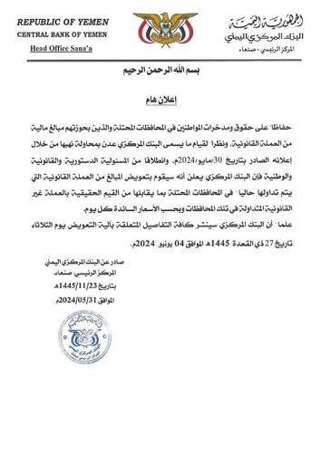 أعلن ما يسمّى بـ "البنك المركزي" التابع لميليشيا الحوثي عن نيته "تعويض" المبالغ من العملة القديمة (ما قبل 2016) في المحافظات "المحررة" بما يقابلها من "القيم الحقيقة" بالعملة القانونية المعترف بها دوليًا، في خطوة جديدة تجسّد نهبها الممنهج لأموال الشعب اليمني.