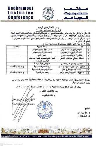أصدر رئيس مؤتمر حضرموت الجامع الشيخ عمرو بن حبريش العليي، اليوم ، القرار رقم (12) لعام 2024م، قضت مادته الأولى بتعين الاخوة التالية أسماءهم كلًا قرين اسمه :