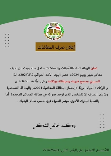 أعلنت الهئية العامة للتأمينات والمعاشات بساحل حضرموت عن صرف معاش شهر يونيو ٢٠٢٤ عصر اليوم عبر شركة البسيري وجميع فروعه وصرافاته ووكلاءه.