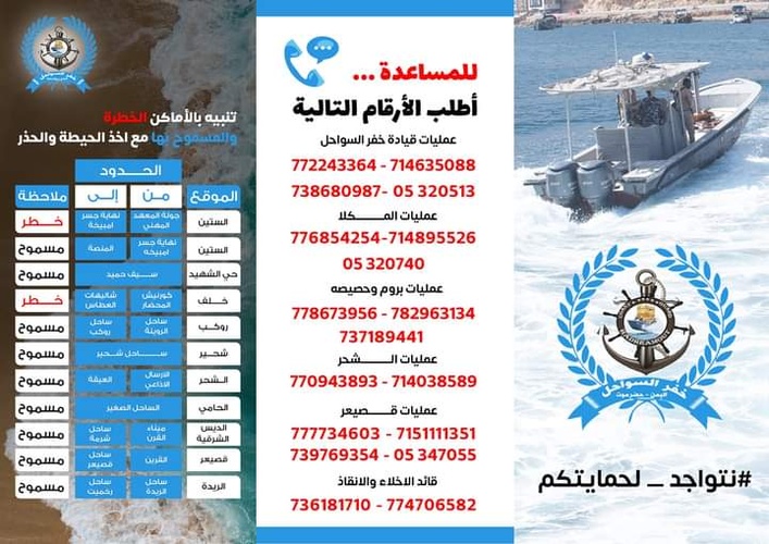 دشنت قوات خفر السواحل بحضرموت، اليوم الخميس، خطة توعوية وإرشادية شاملة لرفع وعي المواطنين بمخاطر البحر خلال موسم البلدة السياحي، وذلك في إطار جهودها الدؤوبة للحفاظ على أرواح المواطنين وضمان سلامتهم.