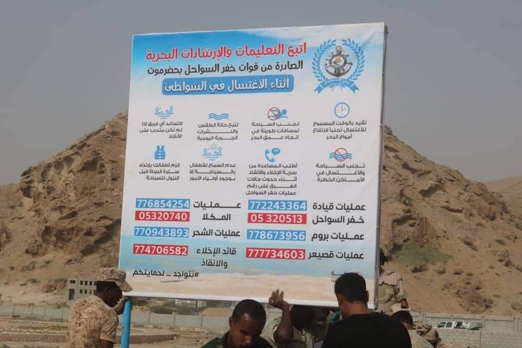 حيث بدأت إدارة التوجيه المعنوي بقوات خفر السواحل بحضرموت بنصب اللوائح الارشادية التحذيرية، بسواحل مدينه المكلا، بهدف رفع وعي المواطنين بمخاطر البحر، وتحديد لهم الأوقات والأماكن المسموح الاغتسال فيها، وتحذيرهم من الأماكن الخطيرة، وكذا ارشادهم اتباع التعليمات والارشادات الصادرة من قوات خفر السواحل.