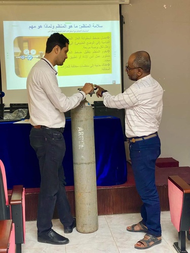 أقيمت ،صباح اليوم، دورة تدريبية بقاعة المركز الوطني لمختبرات الصحة العامة المركزية بساحل حضرموت لفني المختبر تحت عنوان "أساسيات التعامل مع أسطوانات الغاز المضغوط بشكل آمن" لرفع مستوى وعي الفنيين ورؤساء الأقسام بكيفية التعامل الأمن مع أسطوانات الغاز المضغوط.