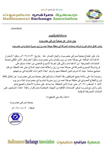وجاء هذا قرار جمعية صرافي حضرموت، نتيجة إستمرار الاعتداءات الواقعة على شركة البسيري للصرافة من قبل مجموعة مسلحة يقودها المدعو بارواس الكثيري.