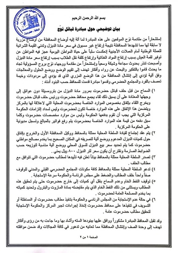 ( الأخ محافظ محافظة حضرموت المحترم تحية وبعد وبناءً على مبادرة ووجهاء قبائل نوَح المحررة 5/10/2024م التي قدموها لسيادتكم وتكرمتم مشكورين بالموافقة على جميع نصوص بنودها كونها تهدف لمعالجة الكثير من الإختلالات والإشكاليات التي تعيشها المحافظة والتي تنعكس سلباً على حياة المواطن اليومية ، فقد قاموا مقادمة ووجهاء قبائل نوَح بعرض بنود هذه المبادرة على الشيخ عمرو علي بن حبريش وكيل أول محافظة حضرموت رئيس حلف قبائل حضرموت ورد عليهم قائلاً : طالما وأن الأخ محافظ حضرموت موافقاً على بنود المبادرة بإمكانه أن يصدر قراراً إدارياً بتسعيرة مادة الديزل للإستهلاك المحلي بمبلغ (800) ريال للتر الواحد وبعد ما يصدر قرار بهذا الخصوص سوف أدعو أعضاء حلف قبائل حضرموت لعقد إجتماع مباشرة لمناقشة قرار المحافظ والرد عليه ولا بتشوفوا مننا إلا كل خير ، وعليه فأن مقادمة قبائل نوَح يطلبوا من سيادتكم كبادرة حسن نيه أن تصدروا القرار أعلاه درءً للفتن وتحسين لمعيشة المواطن . هذا وتقبلوا خالص تحياتنا ).