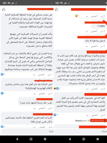 وتضمنت تلك المنشورات مزاعم حول إطلاق قذائف صاروخية ومدفعية وبوراج، وتحركات عسكرية ضخمة تستهدف نقاط حلف قبائل حضرموت.