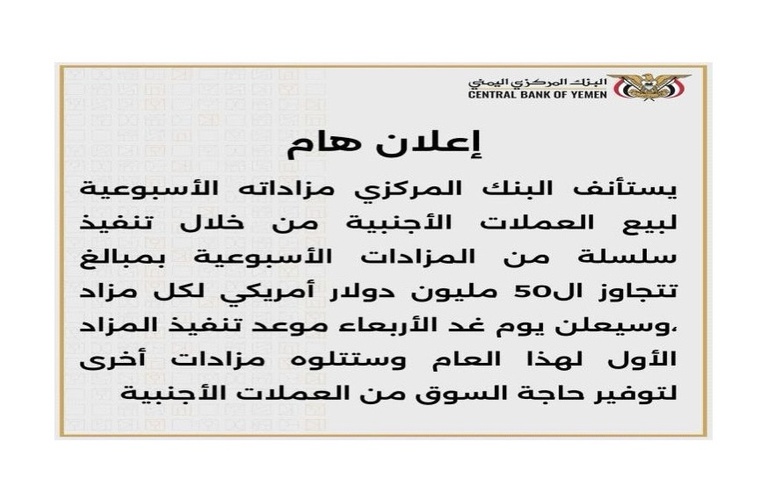 أعلن البنك المركزي اليمني المركز الرئيسي عدن، قبل قليل، عن استئناف مزادات بيع العملات الأجنبية في السوق.