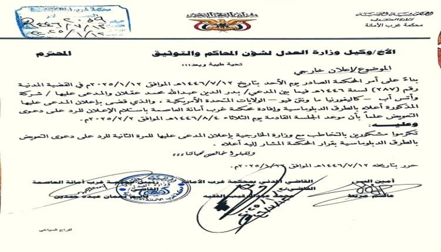 في مشهد يثير السخرية والدهشة، أصدرت إحدى محاكم ميليشيا الحوثي في صنعاء وثيقة رسمية تطالب فيها وزارة الخارجية بمناطق الميليشيا بمخاطبة ولاية كاليفورنيا وتطبيق "واتساب" عبر الطرق الدبلوماسية للمثول أمامها والرد على دعوى تعويض رفعتها المحكمة!