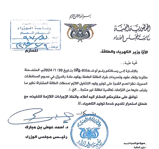 مرفق صورة توجيهات رئيس الوزراء السابق بالغاء العقود.