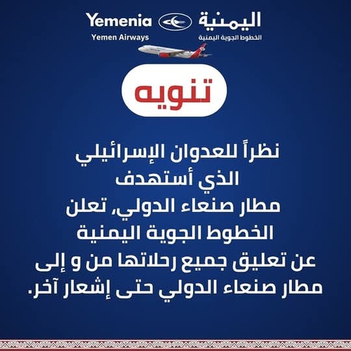 أعلنت الخطوط الجوية اليمنية، في تنويه رسمي، عن تعليق جميع رحلاتها الجوية من وإلى مطار صنعاء الدولي حتى إشعار آخر، وذلك على خلفية العدوان الإسرائيلي الذي استهدف المطار.