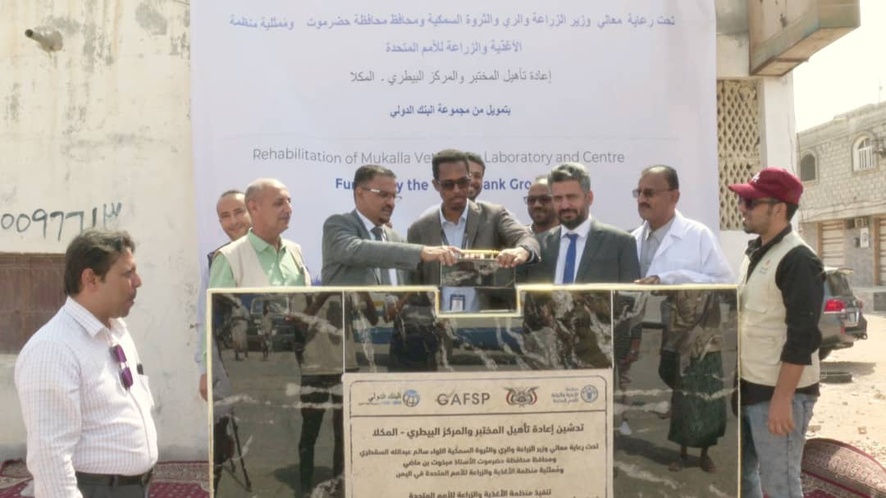 وضع الأمين العام لمحلي محافظة حضرموت الأستاذ صالح عبود العمقي، ومعه مدير مكتب منظمة (الفاو) علي جلول اليوم في مدينة المكلا، حجر الأساس لبدء أعمال مشروع إعادة تأهيل المختبر والمركز البيطري، بتمويل من مجموعة البنك الدولي ضمن برنامج التمويل العالمي للزراعة والأمن الغذائي (GAFSP)، وذلك بالشراكة مع وزارة الزراعة والري والثروة السمكية والسلطة المحلية بمحافظة حضرموت وممثلية منظمة الأغذية والزراعة للأمم المتحدة (الفاو).