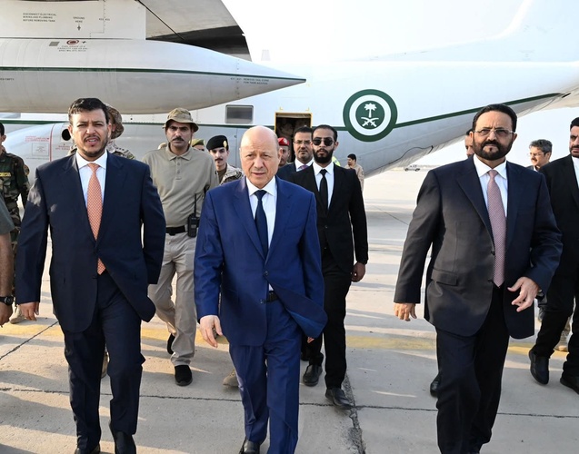 رئيس مجلس القيادة وعضوا المجلس سلطان العرادة وعبدالله العليمي يعودون إلى العاصمة المؤقتة عدن
