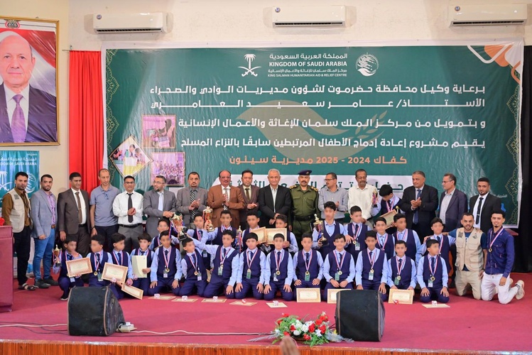 اقام مركز الملك سلمان للاغاثة والأعمال الانسانية، حفل اختتام الدفعة الثالثة من مشروع إعادة إدماج الأطفال المرتبطين سابقًا بالنزاع المسلح بسيئون ( كفاك )، والممول من مركز الملك سلمان للإغاثة والأعمال الإنسانية والمنفذ عبر مؤسسة طيبة للتنمية.