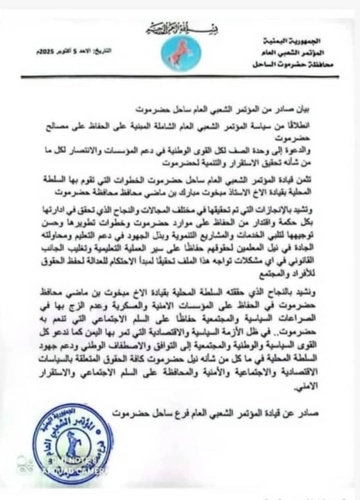 *بيان صادر من المؤتمر الشعبي العام ـ ساحل حضرموت*
