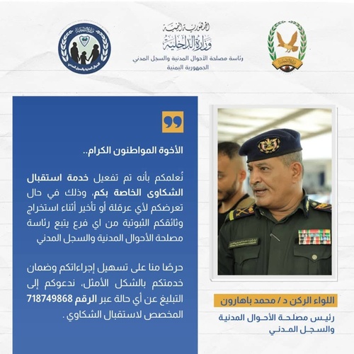 وأوضح اللواء الركن الدكتور محمد باهارون، رئيس مصلحة الأحوال المدنية والسجل المدني، أن إطلاق هذه الخدمة يأتي ضمن جهود المصلحة لتطوير الأداء وتحقيق مبدأ الشفافية والجودة في تقديم الخدمات العامة، مشيدًا بتعاون المواطنين واستجابتهم في الإبلاغ عن أي ملاحظات تسهم في تحسين العمل.