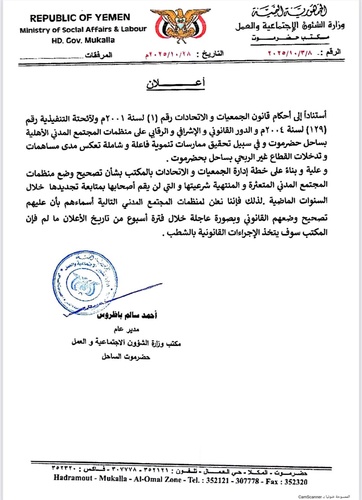 دعا مكتب وزارة الشؤون الاجتماعية والعمل بساحل حضرموت منظمات المجتمع المدني غير الملتزمة بالتصحيح القانوني والإداري إلى سرعة تسوية أوضاعها خلال أسبوع من تاريخ الإعلان.
