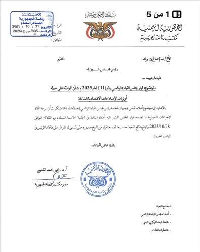 أطلع المجلس على نتائج تنفيذ قرار مجلس القيادة الرئاسي رقم (۹) لعام ۲۰۲٥م بشأن الموجهات الرئاسية للإصلاحات الاقتصادية والمقدم من رئيس مجلس الوزراء وزير المالية وأقر الآتي: