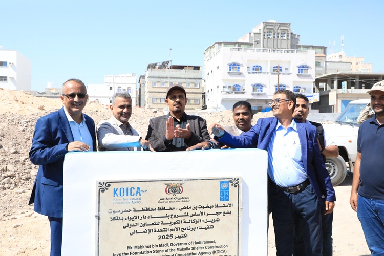 وضع محافظ حضرموت الأستاذ مبخوت مبارك بن ماضي، اليوم بمدينة المكلا، حجر الأساس لمشروع بناء دار الإيواء، بتمويل كريم من الوكالة الكورية للتعاون الدولي (KOICA) وينفذه برنامج الأمم المتحدة الإنمائي (UNDP)، بكلفة 374 ألف دولار أمريكي.