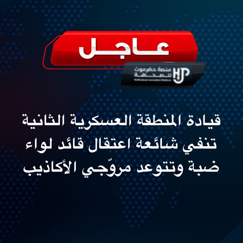 نفت قيادة المنطقة العسكرية الثانية بشكل قاطع، مساء اليوم، ما يتم تداوله في بعض المواقع الإخبارية ومنصات التواصل الاجتماعي من شائعات مغرضة تتحدث عن “اعتقال المقدم الركن بحري ماجد أبوبكر العوبثاني، قائد لواء ضبة”، مؤكدة في بيان رسمي أن الأخبار عارية تماماً من الصحة ولا تمتّ للحقيقة بصلة.