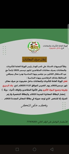 أعلنت الجهات المختصة عن بدء صرف المعاشات التقاعدية للمتقاعدين المدنيين لشهر ديسمبر 2025م، وذلك ضمن الجدول الزمني المعتمد لصرف المستحقات المالية للفئات المستفيدة.