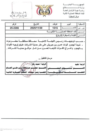 وبحسب الوثيقة الصادرة من قيادة المنطقة العسكرية الثانية، فقد جاءت التوجيهات عقب الاشتباكات التي اندلعت في موقع حماية الشركات، والتي أسفرت عن دخول قوات بن حبريش إلى المقر حماية الشركات.