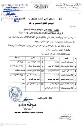 صدر اليوم بمدينة المكلا، قرار مدير عام مكتب وزارة الشباب والرياضة بساحل حضرموت حسن صالح مسجدي، القاضي بالموافقة على مقترح نادي شعب حضرموت بإضافة وتعديل قوام مجلس إدارة النادي.