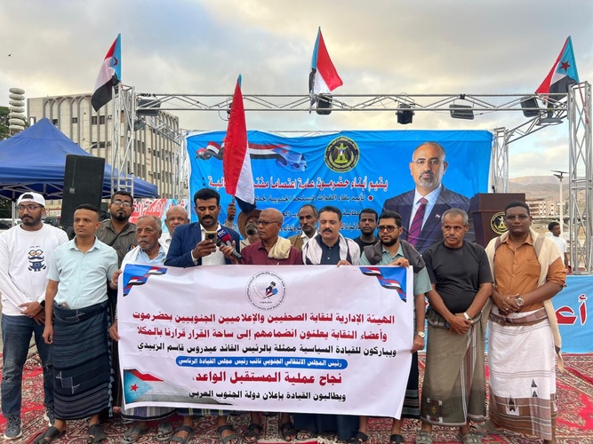 من جانبها، أكدت نقابة الصحفيين والإعلاميين الجنوبيين بحضرموت، في بيان رسمي تلاه الصحفي فاروق العكبري، وقوفها الكامل خلف القيادة السياسية الجنوبية، ممثلة بالرئيس القائد عيدروس بن قاسم الزُبيدي، رئيس المجلس الانتقالي الجنوبي، مطالبًا بالإسراع في إعلان دولة الجنوب العربي.