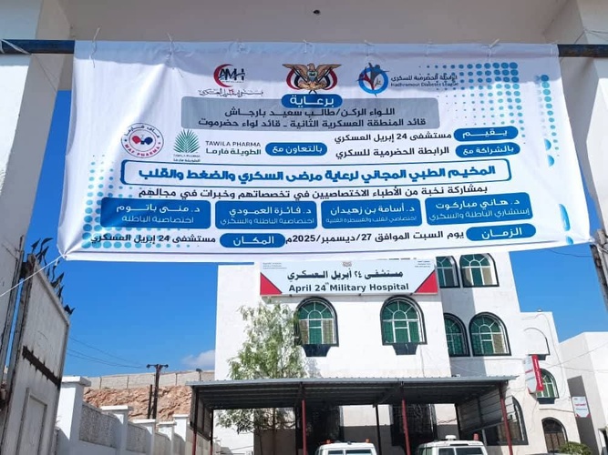 نفّذ مستشفى 24 أبريل العسكري بالمكلا، بالشراكة مع الرابطة الحضرمية للسكري، صباح اليوم، مخيمًا طبيًا مجانيًا لرعاية مرضى السكري وضغط الدم وأمراض القلب، برعاية كريمة من قائد المنطقة العسكرية الثانية، قائد لواء حضرموت، اللواء الركن طالب سعيد بارجاش، وبإشراف مباشر من مكتب الصحة العامة والسكان بساحل حضرموت، وبالتعاون مع شركتي الطويلة فارما للأدوية، وماف فارما للصناعات الدوائية.