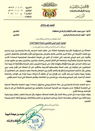 دعت وزارة الأوقاف والإرشاد، خطباء المساجد والعلماء والدعاة في المحافظات المحررة، إلى مساندة جهود الحكومة والسلطات المحلية في تعزيز الوعي المجتمعي، والحفاظ على السكينة العامة، وترسيخ قيم الاعتدال والتعايش بين أفراد المجتمع.