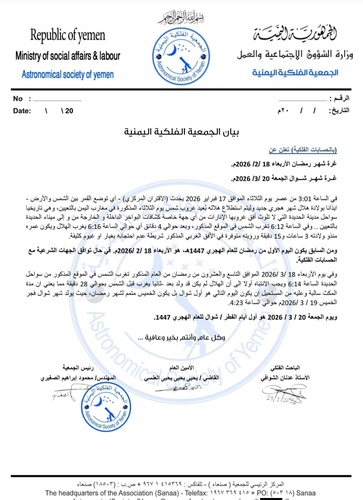 الجمعية الفلكية اليمنية تعلن غرة رمضان وشوال لعام 1447هـ