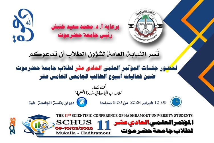 تنطلق في رحاب جامعة حضرموت بعد غد الاثنين أعمال المؤتمر العلمي الحادي عشر لطلابها، الذي تنظمه عمادة شؤون الطلاب، بمشاركة واسعة من الطلاب والباحثين والأكاديميين، مؤذناً بيومين حافلين بالعروض والنقاشات العلمية الجادة.