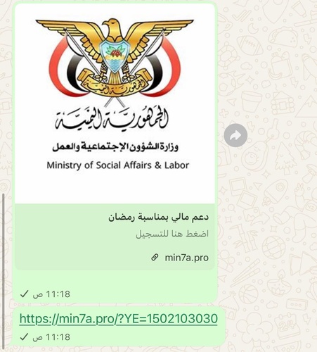 يُحذّر مكتب وزارة الشؤون الاجتماعية والعمل بساحل حضرموت كافة المواطنين من وجود رابط إلكتروني مشبوه يتم تداوله عبر بعض مواقع التواصل الاجتماعي، يدّعي تقديم مساعدات مالية وسلال غذائية مقابل التسجيل وإدخال البيانات الشخصية باسم الوزارة.
