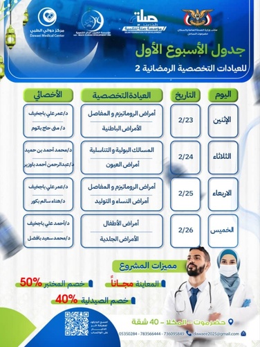 صلة تُعلن جدول الأسبوع الأول للعيادات الرمضانية المجانية بالمكلا