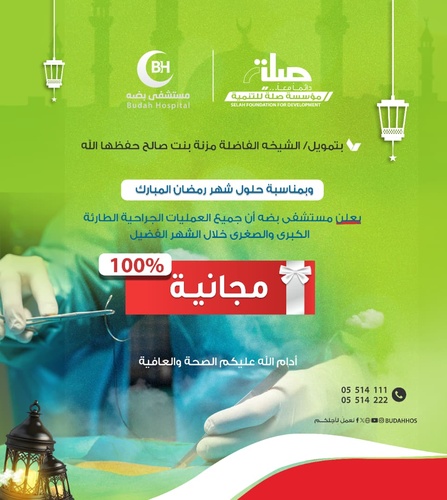 أعلن مستشفى بضه عن تقديم جميع العمليات الجراحية الطارئة، بنوعيها الكبرى والصغرى، مجانًا طوال أيام شهر رمضان المبارك، وذلك بتمويل كريم من مزنة بنت صالح ضمن مبادرة خيرية تهدف إلى تخفيف الأعباء الصحية عن الأهالي في المناطق المستفيدة.