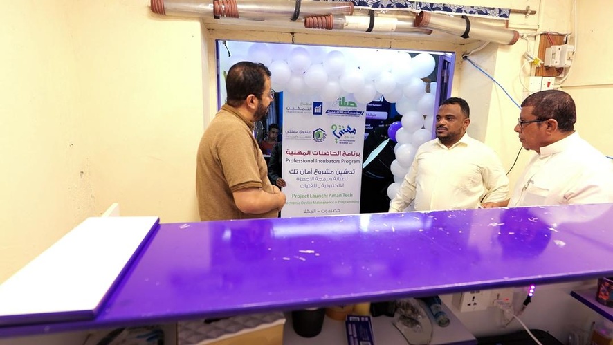 افتتح المدير التنفيذي لمؤسسة صلة للتنمية الأستاذ علي حسن باشماخ، مشروع “أمان تك”، لصيانة وبرمجة الأجهزة الإلكترونية للفتيات، اليوم، بالمكلا، ضمن المشاريع التي تنفذها وتمولها المؤسسة لدعم الفتيات وتمكينهن مهنياً، في إطار برنامج الحاضنات المهنية (مهنتي بين يدي 9).