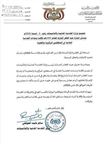 أصدرت وزارة الخـدمة المدنية والتأمينات تعميماً بشأن إجـازة عيد الفطر المبارك للعام 1447هـ لكافة وحـدات الخـدمة العامة في السلطتين المركزية والمحلية .