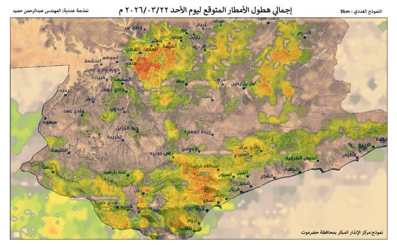 تشير أخر تحديثات تحاليل خرائط الطقس والنماذج العددية الإقليمية إلى بداية تاثير حالة ربيعية من عدم الاستقرار الجوي على محافظات بلادنا تشمل أجزاء واسعة من محافظة حضرموت خلال 72 ساعة القادمة.