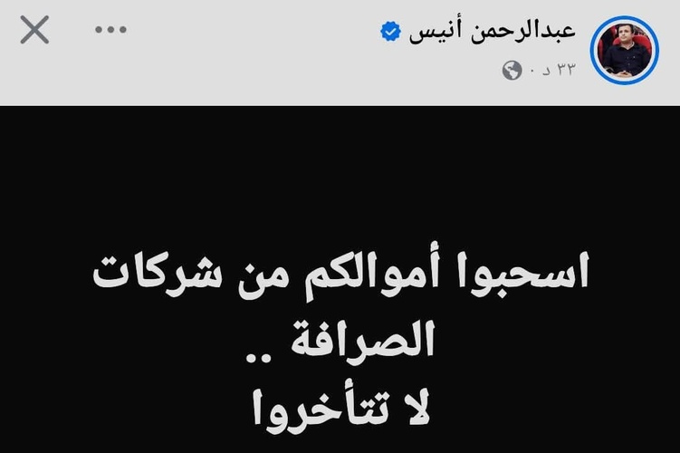 وفي هذا السياق، أثار الصحفي عبد الرحمن أنيس جدلًا واسعًا بعد دعوته العلنية للمواطنين إلى سحب أموالهم من شركات الصرافة، محذرًا من تأخر قد يضع المدخرات في دائرة الخطر، وهو ما انعكس سريعًا على سلوك المتعاملين، حيث لوحظ تزايد الإقبال على سحب الودائع بشكل لافت في بعض المناطق.